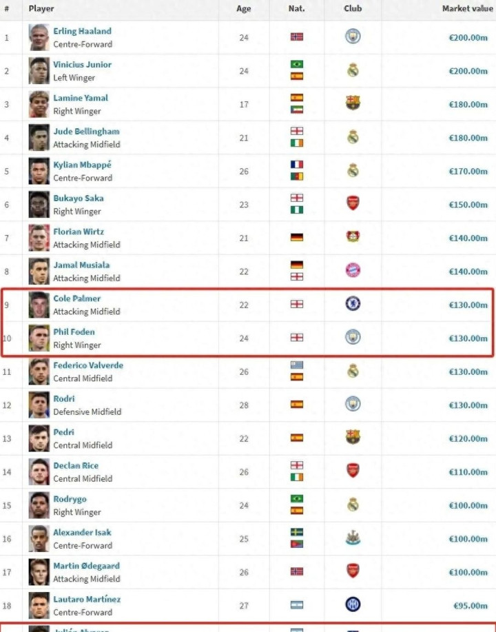 德转最新身价榜单揭示了一个荒谬现象:连续3个月无所作为的英格兰双子星福登与帕尔默,身价高达1.3亿欧元,稳居第9、10位。而近4场比赛狂轰4球的阿根廷射手阿尔瓦雷斯,却仅值9000万欧元,勉强挤进第19位。